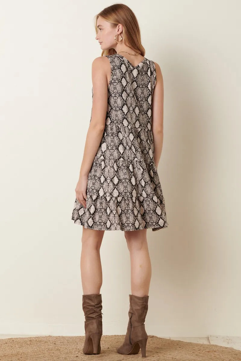 The Snake Print Ruffle Detail Tank Dress is a chic and edgy piece that combines a trendy snake print with feminine ruffle detailing. The snake print adds a bold and fashion-forward element to the dress, while the ruffle detail brings a touch of charm and sophistication. This tank dress is perfect for making a statement at summer events or outings, offering a stylish and unique look. Pair it with sandals or heels for a fashionable ensemble that showcases your individual style with a hint of attitude.